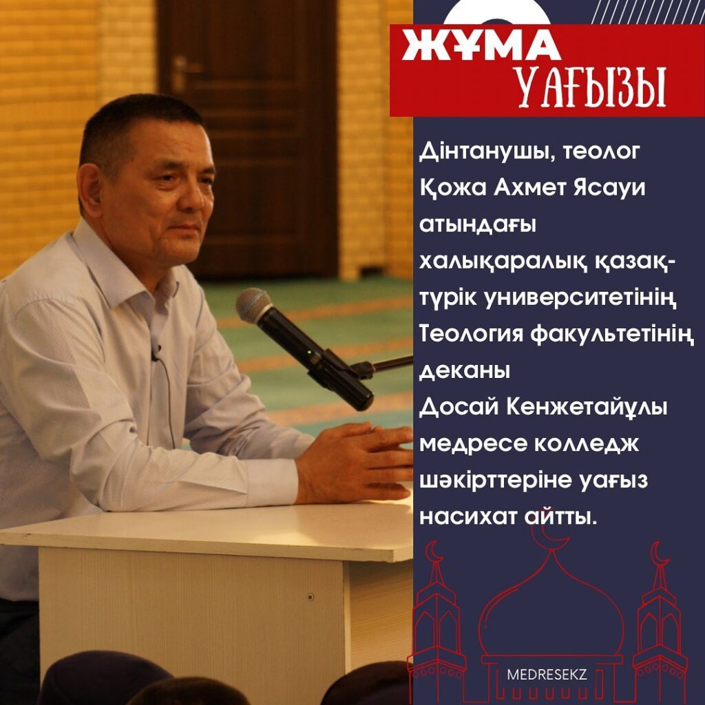 ⚜️Дінтанушы, теолог Қожа Ахмет Ясауи атындағы халықаралық қазақ-түрік университетінің Теология факультетінің деканы Досай Кенжетайұлы медресе колледж шәкірттеріне Қожа Ахмет Ясауи бабамыздың хикметтеріне, Абай Құнанбаев мұраларындағы дін жайында жазбаларына кеңінен тоқталып, білім алудағы әдеп жайлы да уағыз насихат айтты.