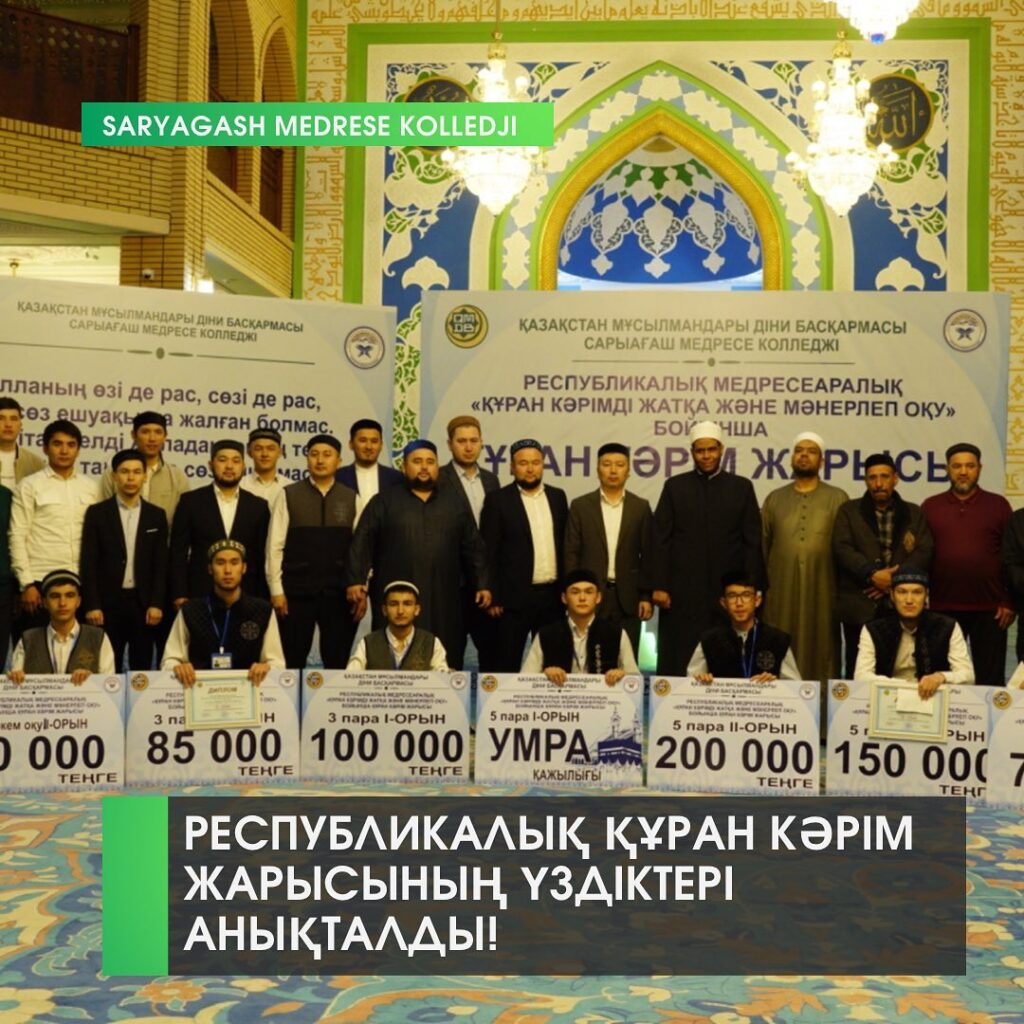 11-наурыз күні ҚМДБ тікелей қолдауымен Сарыағаш медресе колледжінде Республикалық Медресеаралық Құран кәрім жарысы болып өтті. Ауқымды шараға ҚМДБ Діни білім және кадр даярлау бөлімінің меңгерушісі Смайыл Сейтбеков арнайы қатысып ҚМДБ Төрағасы, Бас мүфти Наурызбай қажы Тағанұлы Хазіреттің арнайы сәлемін халыққа жеткізді. Сайыс екі бөлімнен тұрды. Бірінші бөлімде қыздар арасында “3 пара” және “2 пара” және “Құранды мәнерлеп оқудан” жарыс болса, екінші бөлімде ерлер арасында үш номинация: “ 5 пара”, “ 3 пара” , “ Құранды мәнерлеп оқу” бойынша бақтарын сынға салды. Қыздар арасында медресеміздің атынан қатысып мәнерлеп оқу номинацисы бойынша 2-орынды Қабылхан Дариға еншілесе, 2 пара бойынша 3-орынға Оғалиқова Ортиқой шәкіртіміз жайғасты. Ал ерлер арасындағы тартысты бәсекеде 5 пара бойынша бас жүлде Жұмағұл Ырысалды шәкіртімізге бұйырса, 3 пара