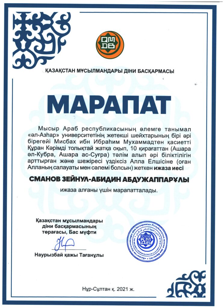 Еске салсақ, Зейнул-Абидин Сманов 10 қырағатта ижаза алған елдегі алғашқы қари.