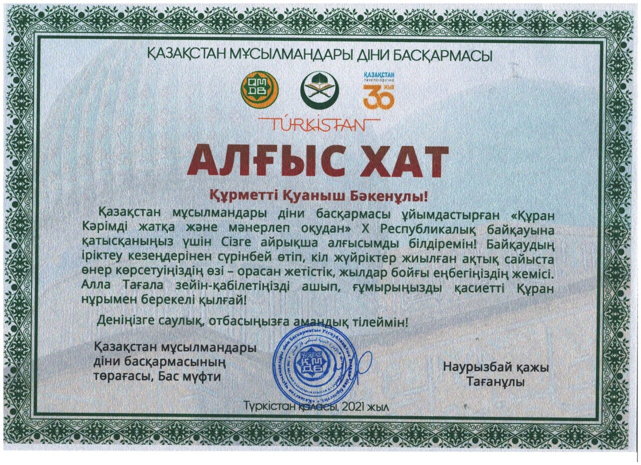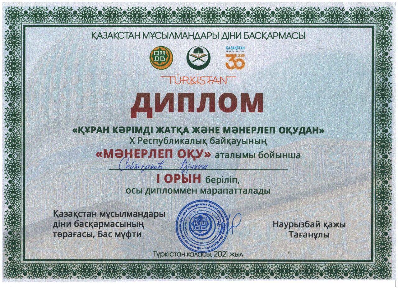 Республикалық Құран жарысынан “Мәнерлеп оқу” бойынша “Сарыағаш” медресе-колледжінің түлегі, “Нұр-Мүбарак” университетінің магистры, “Сатыбалды Әбішұлы” мешітінің Бас азаншысы Қуаныш Сейітханов бірінші орын алды. 74 үміткер бақ сынаған байқауда жеңіс тұғырынан көріну біз үшін үлкен мәртебе. Елімізде Құранға ықылас қойған жастар көбейе берсін!