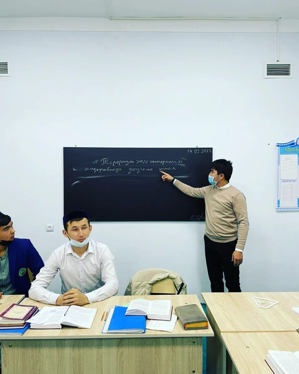14.02.2022. күні Сарыағаш медресе колледжінде 13-11-91 тобының қатысуымен жоспарға сай «Терроризм және интернет» тақырыбында дөңгелек үстел болып өтті. Дөңгелек үстелді арнайы пән мұғалімі Нашуран Айбек ұстаз жүргізіп, басты пікірталастар терроризмді