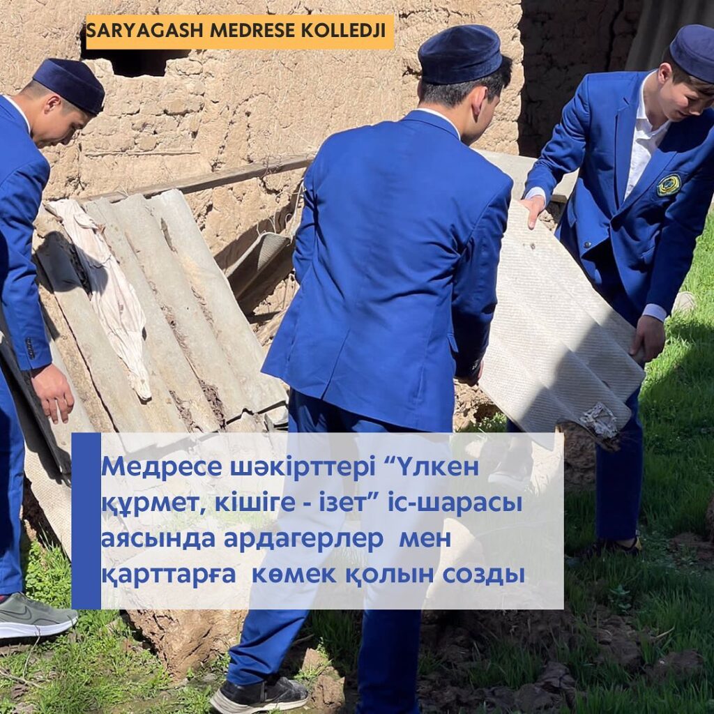 Сарыағаш медресе колледжі және Жарты-төбе ауыл әкімшілігімен бірлесіп «Үлкенге құрмет кішіге ізет» атты қайырымдылық шарасын ұйымдастырды. Аталған игі істің аясында медресе колледж шәкірттері ардагерлер және ауыл қарттарының үйіне барып,қолдан келгенше ауланың тазалық жұмыстарына жұмыла атсалысып, қариялардың ақ батасын алды. Сондай-ақ, бір реттік азық-түлікпен қамтамасыз етті. Жастарымызды игі іске тәрбиелейтін осындай ізгі бастамалар көбейе берсін!