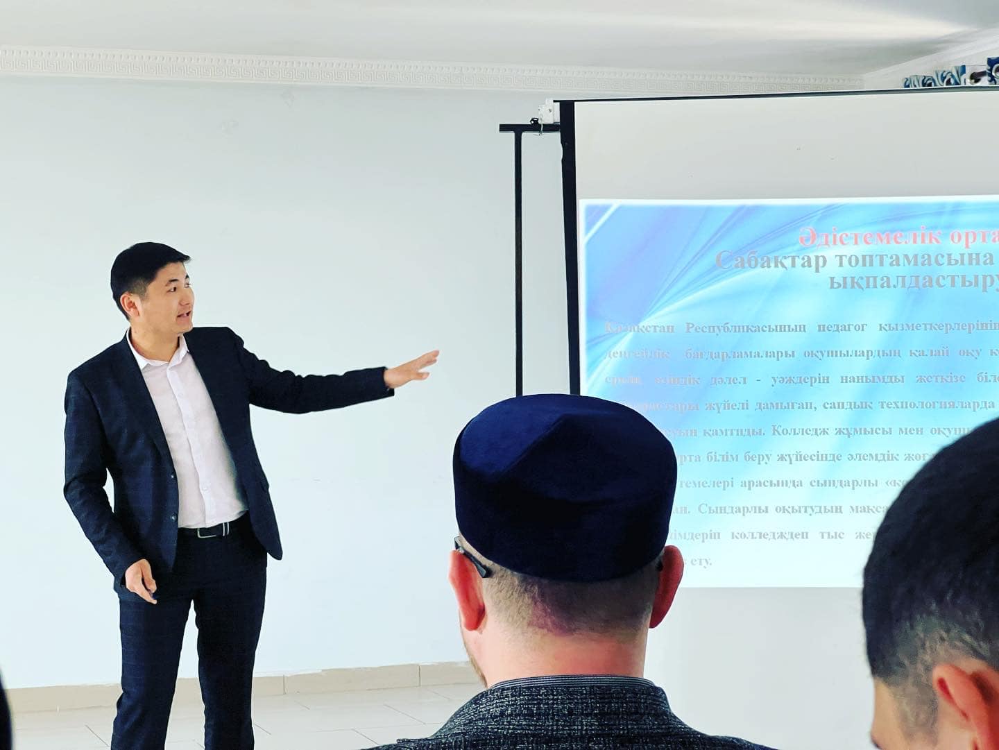 Колледжіміз әдіскерлері Қалмұратов Темур мен Сманова Нуржамал ұстаздардың ұйымдастыруымен оқытушылардың кәсіби-педагогикалық деңгейін ұдайы көтеру, олардың теориялық білімі мен әдістемелік біліктілігін үздіксіз жетілдіру, модульдік оқыту бағдарламасының мақсаттары, оқытудың озық әдіс-тәсілдері, тәжірибе барысында пайдалануға бағыттау, жаңа технологияларды, идеялар мен көзқарастарды саралау, шығармашылық жұмыстарына жол көрсету, білім мен бәсекеге қабілетті ұрпақ тәрбиелеу мақсатында «Тиімді әдіс-тәсілдер — сапалы білім кепілі» атты тақырыпта семинар өткізілді. Семинарды жалпы және әлеуметтік пәндер кафедрасы оқытушысы, әдіскер Қалмұратов Темур жүргізді. Компьютерлік технология арқылы 10-нан аса әдіс-тәсілдердің дәрісте қолдану мақсаттарын түсіндіре отырып, тәжірибеде көрсетті.