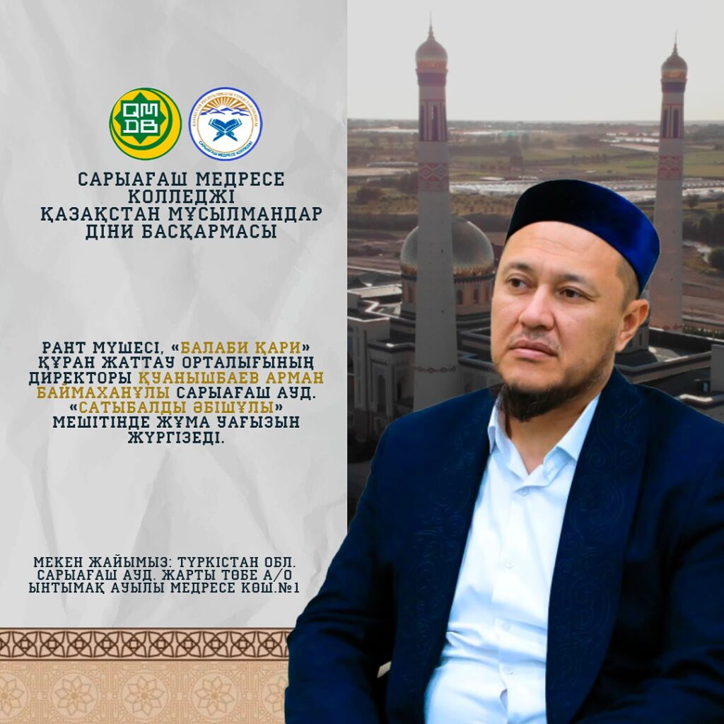 ⚜️Рант Мүшесі “Балаби қари” Құран жаттау орталығының директоры Қуанышбаев Арман Баймаханұлы Сарыағаш ауд. “Сатыбалды Әбішұлы” мешітінде жұма уағызын жүргізеді!