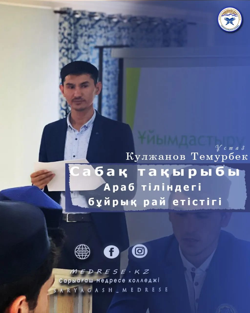 Колледжімізде 13-11-11 тобында “Араб тілі морфологиясы” пәнінен Араб тіліндегі бұйрық рай етістігі тақырыбында ашық сабақ өткізілді.Ашық сабақты арнайы пән оқытушысы Кулжанов Темурбек ұстаз өткізді.Сабақтың мақсаты — студенттердің сөздің қорын дамытып,