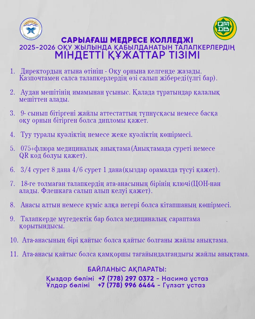 📞 Қыздар бөлімі: +7 (778) 297 0372 — Насима ұстаз