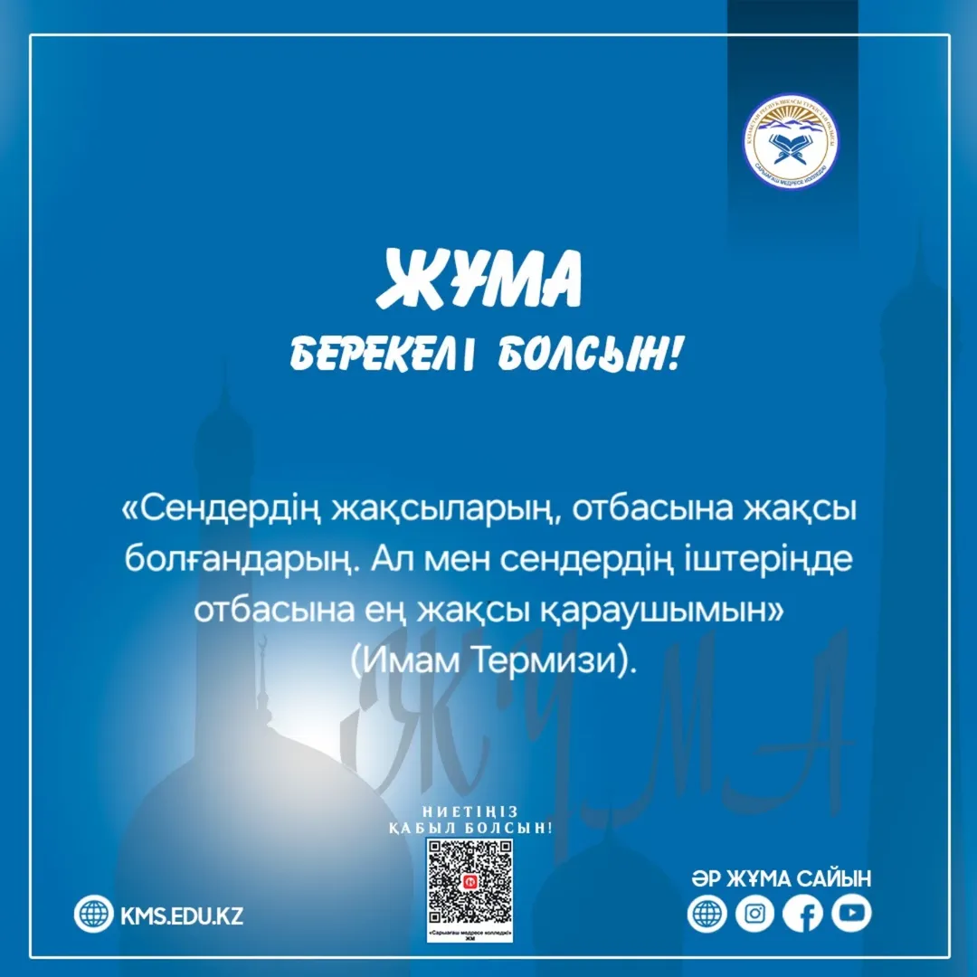 🤲 Жұма мүбәрак болсын, құрметті жамағат!Алла Тағала адамзатқа берген ең үлкен нығметтерінің бірі – отбасы. Отбасы – мейірімнің мекені, тыныштықтың ордасы, сүйіспеншілік пен түсіністіктің алтын ұясы.Құран Кәрімде:»Әрі Ол сендерге өздеріңнен жұбайлар жаратты. Солардың қасында жан тыныштығын табуларың үшін. Сондай-ақ араларыңа сүйіспеншілік пен мейірім салды. Шын мәнінде ойланатын ел үшін ғибраттар бар» (Рум сүресі, 21-аят).Осы қасиетті жұма күні әр шаңыраққа береке, әр жүрекке тыныштық нәсіп болғай! Отбасыңыз аман, ырысыңыз берекелі, бірлігіңіз бекем болсын!