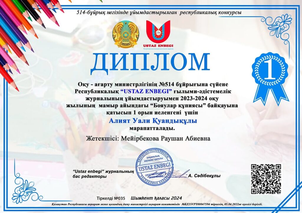 “ Бояулар құпиясы” атты байқаудан 1-орын алған Алият Уали Қуандықұлы осы дипломмен марапатталады.
