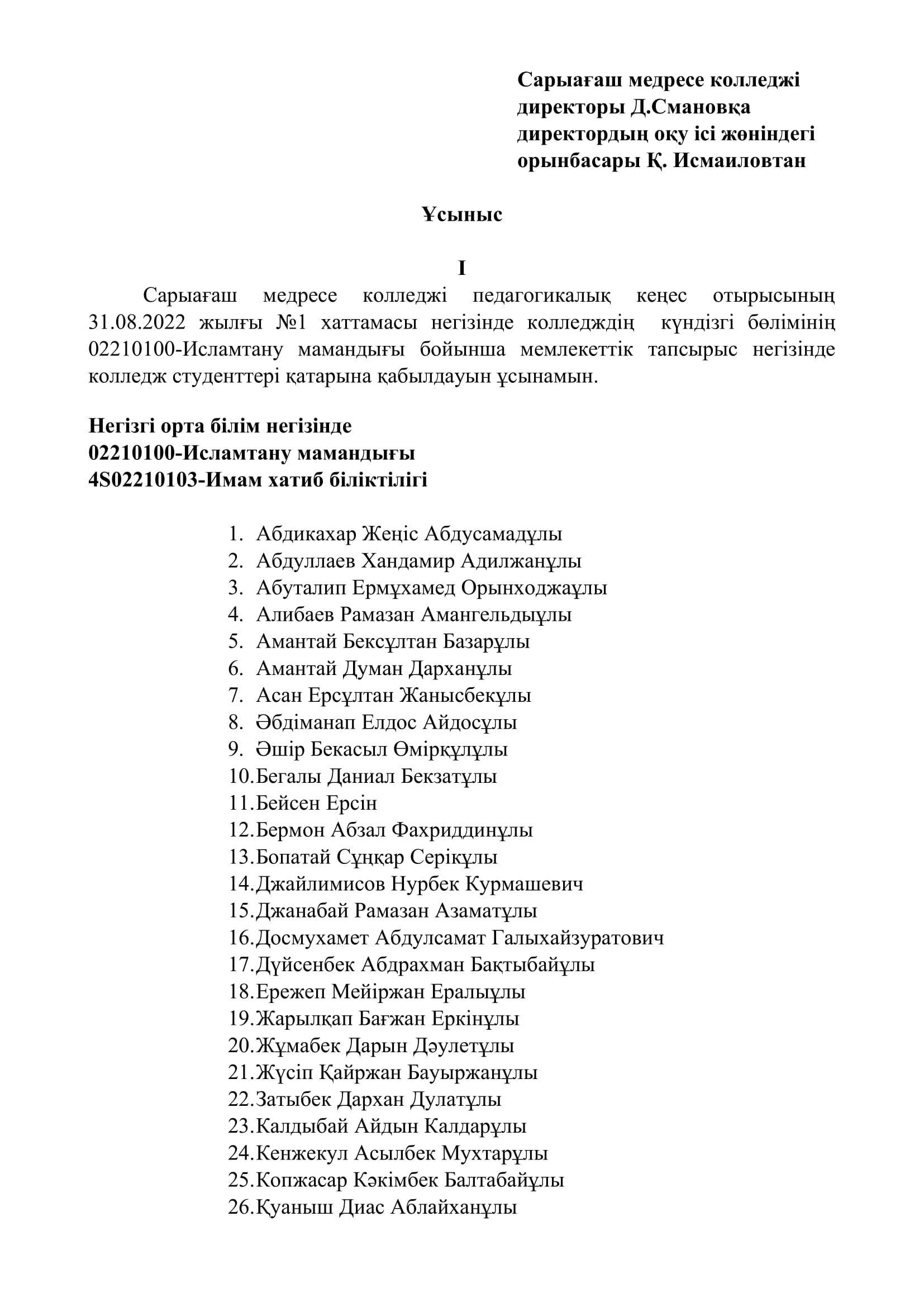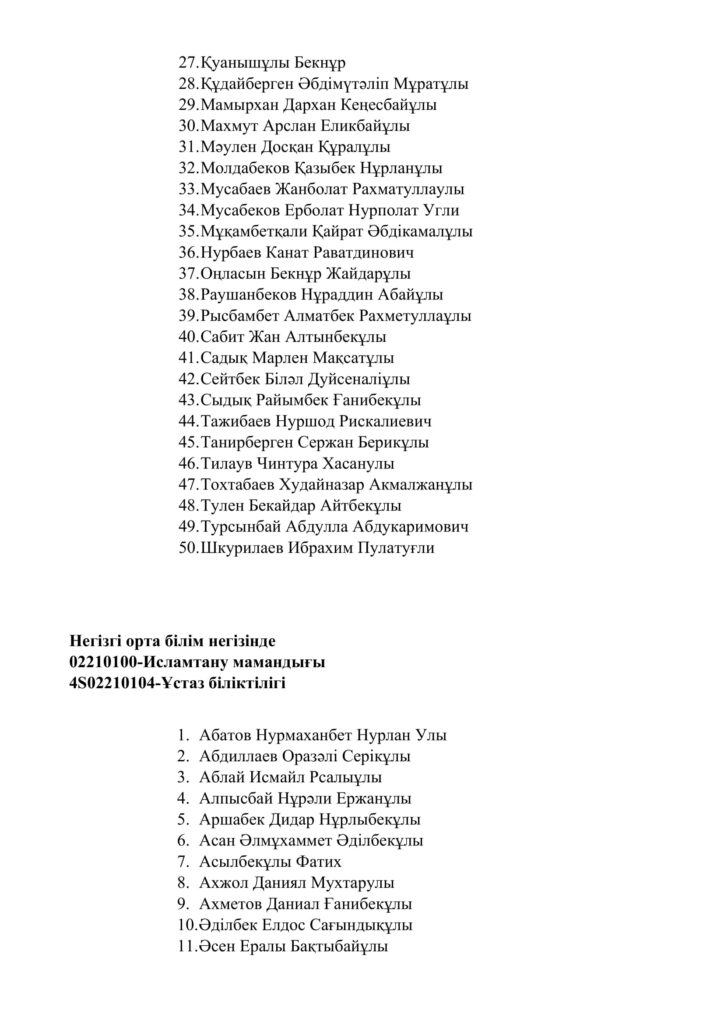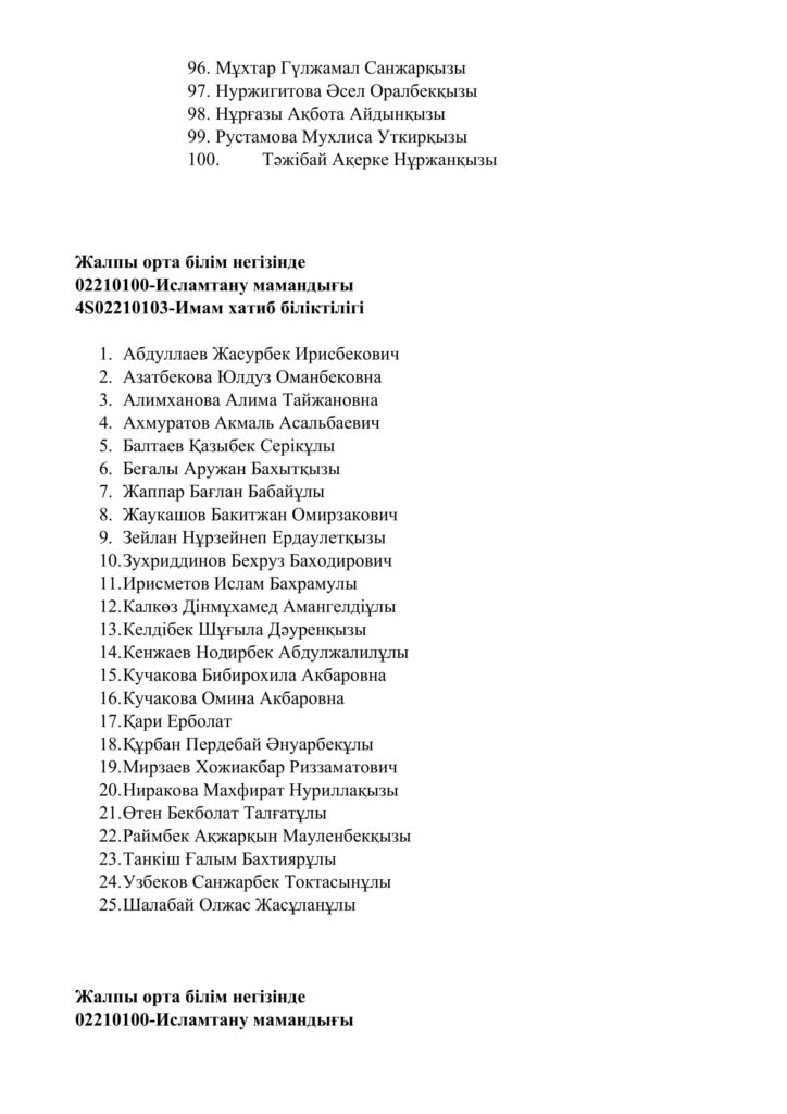 2022-2023 жаңа оқу жылында Сарыағаш медресе колледжіне 02210100-Исламтану мамандығы бойынша құжат тапсырған жас талапкерлердің арасында конкурс арқылы мемлекеттік 200 грант иелері анықталды.