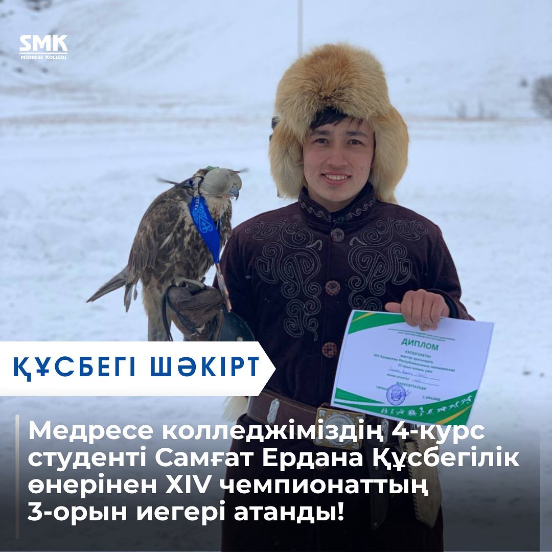 СПОРТ ЖӘНЕ ДЕНЕ ШЫНЫҚТЫРУ ІСТЕРІ КОМИТЕТІНІҢ ҰЙЫМДАСТЫРУЫМЕН РЕСПУБЛИКАЛЫҚ Құсбегілік өнерінен жастар арасында XIV чемпионаты өткізілді. Аталған чемпионатта «Сарыағаш медресе колледжінің» 4 курс студенті Самғат Ердана III-орынды иемденіп, арнай дипломмен марапатталды!